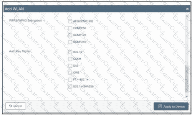 Refer to the exhibit. A customer asks an engineer to create a new secure WLAN to support only WPA3. Users must connect using a passphrase. Which encryption and key management configuration is required?