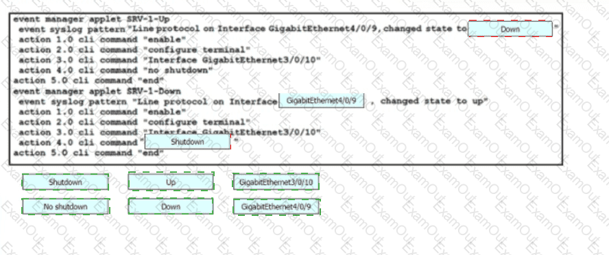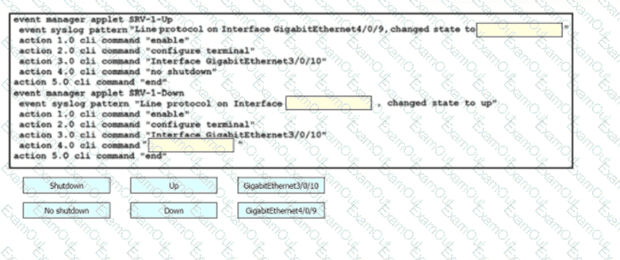 Drag and drop the snippets onto the blanks within the code to construct a script that brings up the failover Ethernet port if the primary port goes down and also shuts down the failover port when the primary returns to service. Not all options are used.