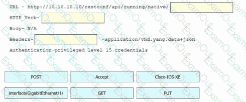 Refer to the exhibit. Drag and drop the snippets into the RESTCONF request to form the request that returns this response. Not all options are used.