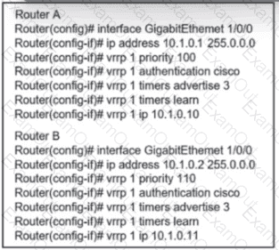 Refer to the exhibit. An engineer must adjust the configuration so that Router A becomes the active router. Which commands should be applied to router A? (Choose two)