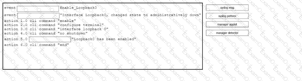 Drag and drop the command snippets from the right onto the blanks in the configuration to create an EEM applet that will enable interface Loopback0 and log a message when the logging message -Interface Loopback0. changed state to administratively down" is received. Not all commands are used.