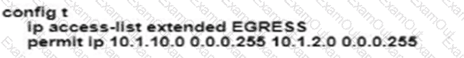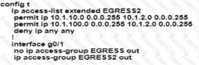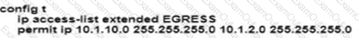 An engineer must modify the access control list EGRESS to allow all IP traffic from subnet 10.1.10.0/24 to 10.1.2.0/24. The access control list is applied in the outbound direction on router interface GigabitEthemet 0/1. Which configuration commands can the engineer use to allow this traffic without disrupting existing traffic flows?