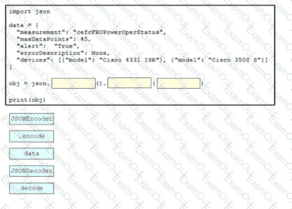 Drag and drop the code snippets from the bottom onto the blanks in the script to convert a Python object into a JSON string. Not all options are used