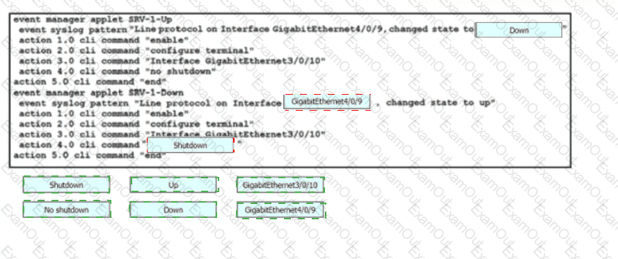 Drag and drop the snippets onto the blanks within the code to construct a script that brings up the failover Ethernet port if the primary port goes down and also shuts down the failover port when the primary returns to service. Not all options are used.