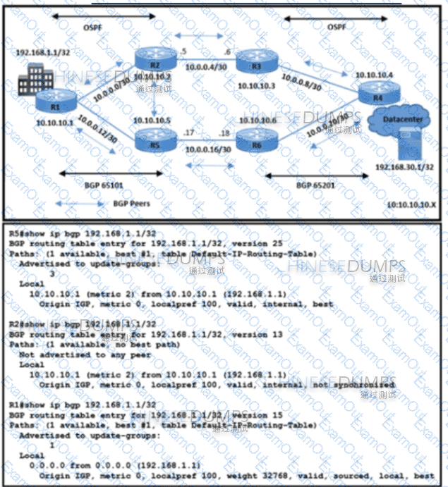 Refer to the exhibit. All BGP peering in AS 65101 and 65201 is enabled. The operations team is told that traffic destined to 192.168.1.1/32 from R4 does not use the path R3-R2-R1 as expected. An engineer debugs the issue and determines that 192.168.1.1/32 is advertised in the BGP routing table on R1. Which action resolves the issue?