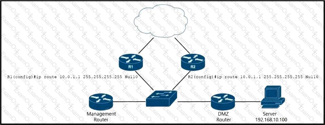 Refer to the exhibit. EIGRP is running across the core to exchange internal routes, and each router maintains iBGP adjacency with the other routers on the network. An operator has configured static routes on the edge routers R1 and R2 for IP address 10.0.1.1, which is used as a black hole route as shown. Which configuration should the operator implement to the management router to create a route map that will redistribute tagged static routes into BGP and create a static route to blackhole traffic with tag 777 that is destined to the server at 192.168.10.100?