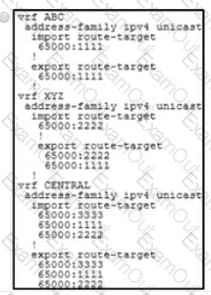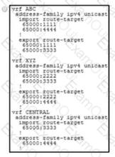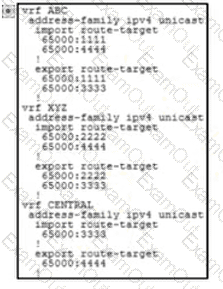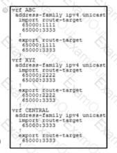 An engineer is setting up overlapping VPNs to allow VRF ABC and XYZ to communicate with VRF CENTRAL but wants to make sure that VRF ABC and XYZ cannot communicate. Which configuration accomplishes these objectives?