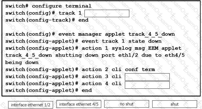 An engineer must shut down the Ethernet 1/2 interface when the Ethernet 4/5 interface state is down. Drag and drop the CLI commands from the bottom onto the blanks in the exhibit to implement this EEM. Not all commands are used.