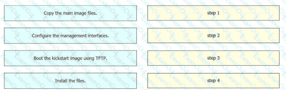 Drag and drop the steps on the left onto the order that they must be implemented on the right to recover a fabric interconnect when there is no working image on the bootflash.