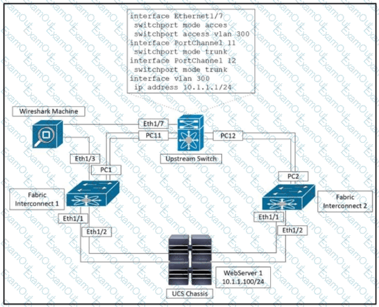 Refer to the exhibit. An engineer is troubleshooting a connection issue from the virtual machine that is located on the Webserver 1 blade. The application team requested a packet capture for all traffic that is transferred to and from Webserver 1. The engineer confirmed that the host server vNIC1 has VLAN 300 assigned to It. Which action must be taken to capture the traffic?