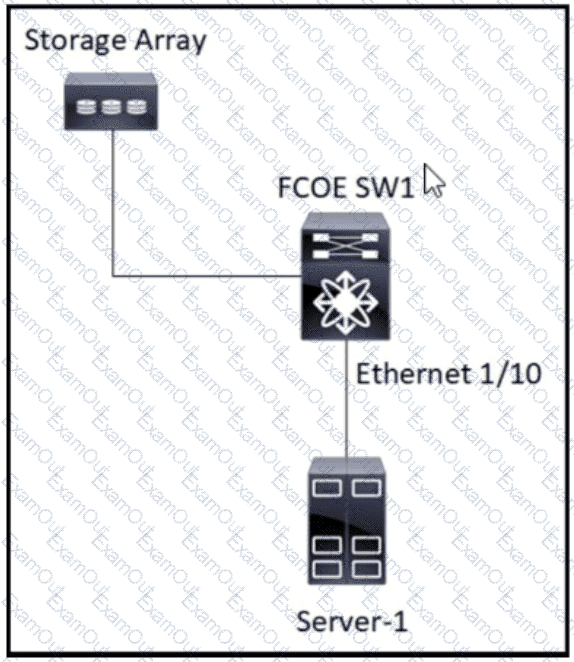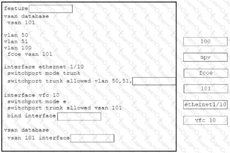 Refer to the exhibit. Server 1-must establish an FCoE connection with SW1. Drag and drop the code snippets from the right onto the boxes in the code to complete the FCoE configuration of SW1. Not all code snippets are used.