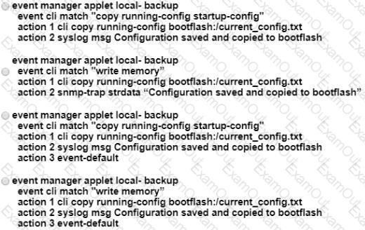 A network engineer must create an EEM script that saves a copy of the running configuration on bootflash and writes a message to syslog when a user saves the configuration to a Cisco Nexus switch. Which configuration set should be applied to complete this task?