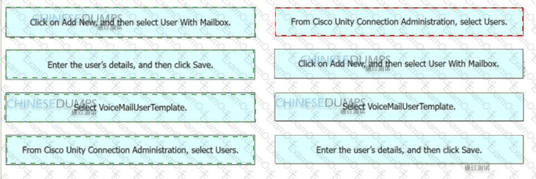 An engineer must add a new user account and mailbox in Cisco Unity Connection. Drag and drop the configuration steps from the left into the correct order on the right.