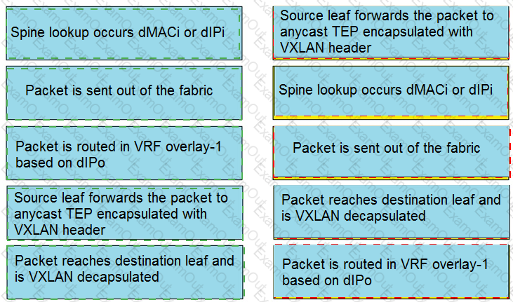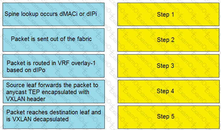 A leaf receives unicast traffic that is destined to an unknown source, and spine proxy is enabled in the corresponding bridge domain. Drag and drop the Cisco ACI forwarding operations from the left into the order the operation occurs on the right.