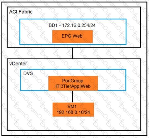 An organization migrates its virtualized servers from a legacy environment to Cisco ACI. VM1 is incorrectly attached to PortGroup IT|3TierApp|Web.