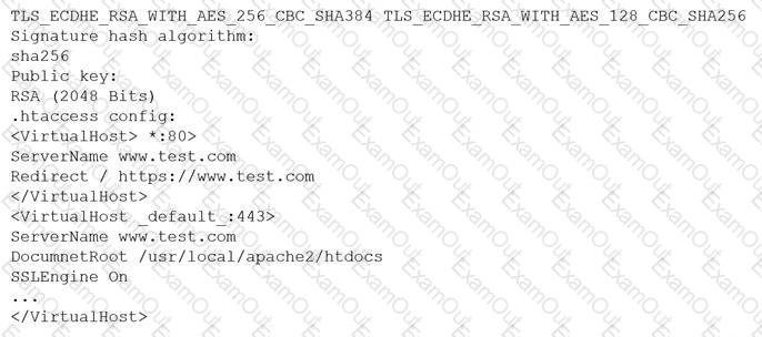 A customer reports being unable to connect to a website at www.test.com to consume services. The customer notices the web application has the following published cipher suite: