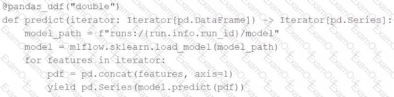 A data scientist has defined a Pandas UDF function predict to parallelize the inference process for a single-node model: