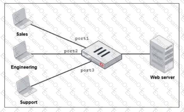 FortiGate has two separate firewall policies for Sales and Engineering to access the same web server with the same security profiles.