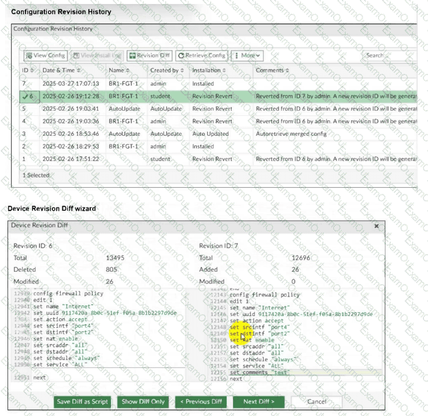 An administrator admin used the Configuration Revision History window to revert the FortiGate device configuration to revision ID 6. After running the reinstall policy package, the administrator noticed problems with the firewall policy- they could not see the unset comment on policy ID 1.
