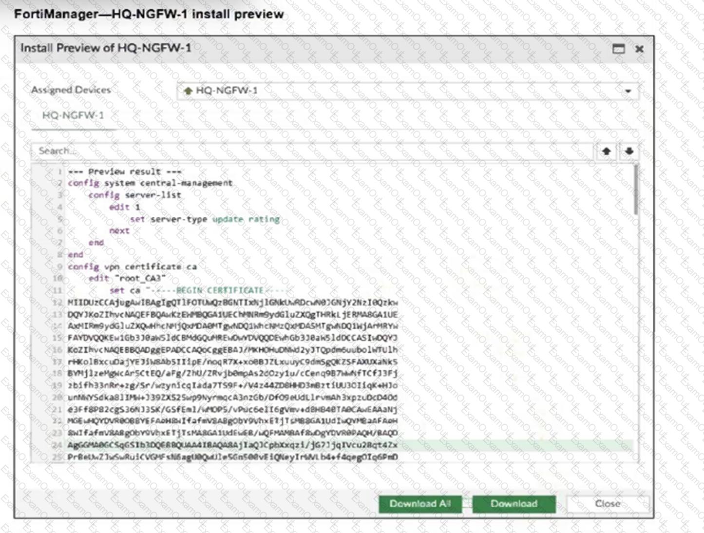 An administrator assigned a new policy package to FortiGate HQ-NGFW-1. In the installation preview, they noticed some settings they did not modify and are unsure about the changes.