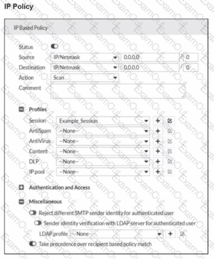 Refer to the exhibits, which show a topology diagram (Topology) and a configuration element (IP Policy).
