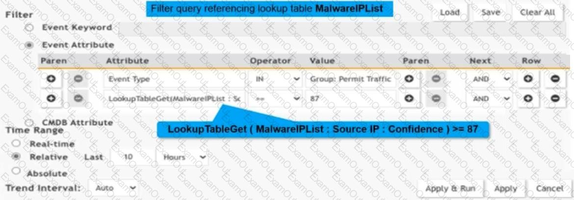 Consider a custom lookup tableMalwareIPList. An analyst constructed an analytic query to reference theMalwareIPListlookup table.