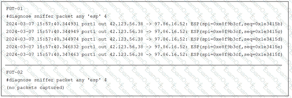 The sniffer log on two FortiGate devices are shown. Based on the information in the log, which two factors explain the output on FortiGate FGT-02? (Choose two answers)