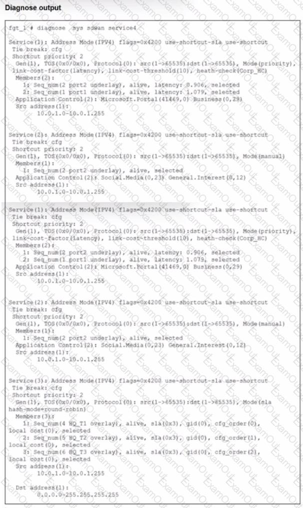 The exhibit shows output of the command diagnose sys adwan aervice4 collected on a FortiGate device.