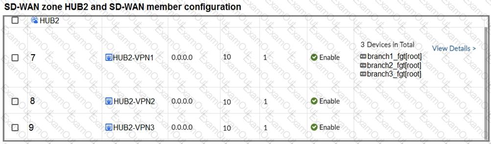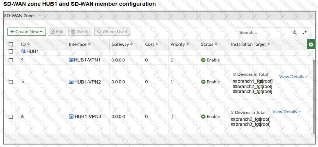 The first exhibit shows the SD-WAN zone HUB1 and SD-WAN member configuration from an SD-WAN template, and the second exhibit shows the output of command diagnose sys sdwan member collected on a FortiGate device.