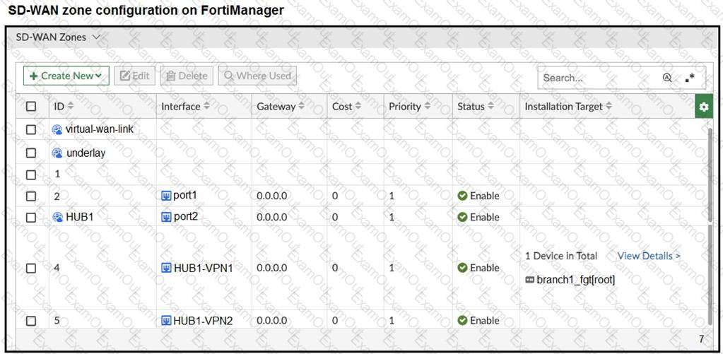 The exhibits show the SD-WAN zone configuration of an SD-WAN template prepared on FortiManager and the policy package configuration.