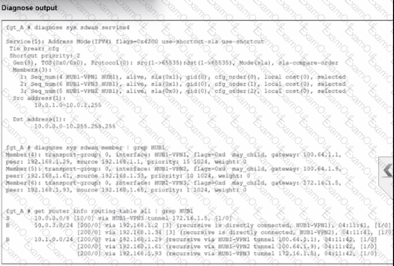 The exhibit shows output of the command diagnose sys sdwan service collected on a FortiGate device.