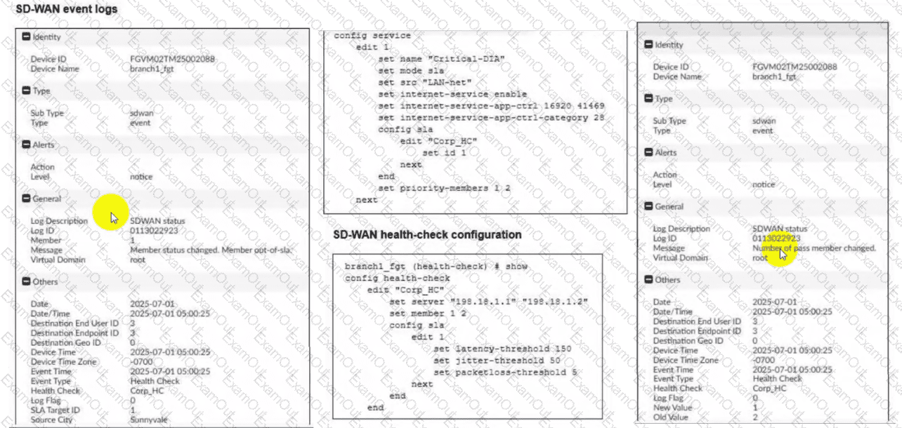 Two SD-WAN event logs, the member status, the SD-WAN rule configuration, and the health-check configuration for a FortiGate device are shown. Immediately after the log messages are displayed, how will the FortiGate steer the traffic based on the information shown in the exhibits? (Choose one answer)