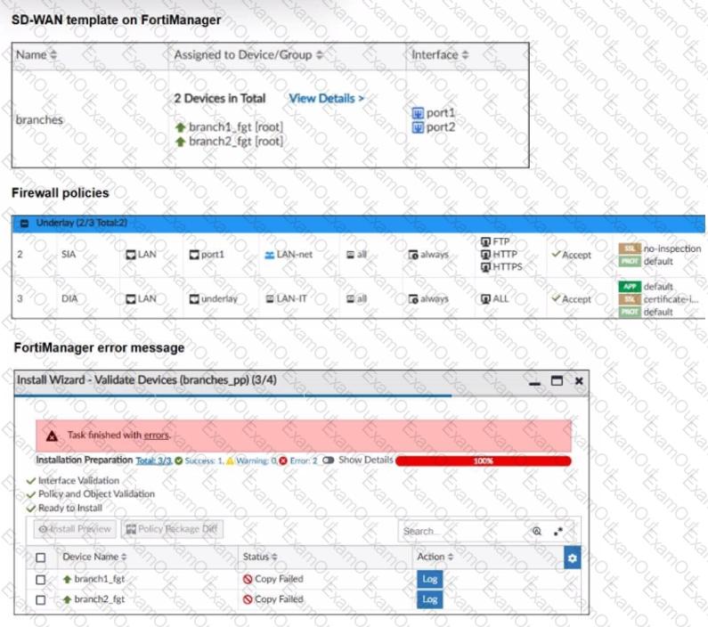 You use FortiManager to manage the branch devices and configure the SD-WAN template. You have configured direct internet access (DIA) for the IT department users. Now. you must configure secure internet access (SIA) for all local LAN users and have set the firewall policies as shown in the second exhibit.