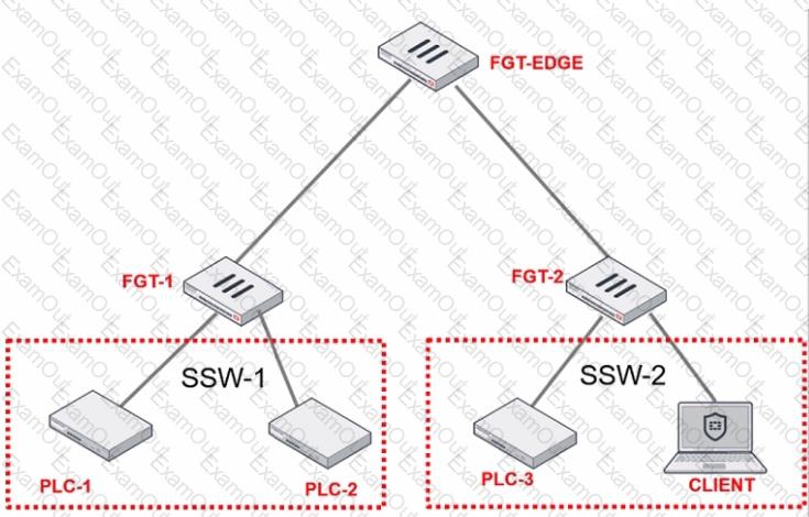 PLC-3 and CLIENT can send traffic to PLC-1 and PLC-2. FGT-2 has only one software switch (SSW-1) connecting both PLC-3 and CLIENT. PLC-3 and CLIENT cannot send traffic to each other.