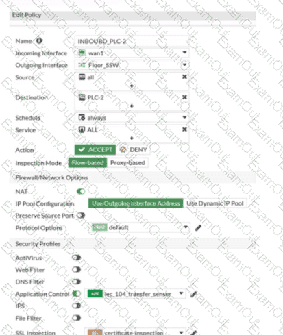 An OT architect has implemented a Modbus TCP with a simulation server Conpot to identify and control the Modus traffic in the OT network. The FortiGate-Edge device is configured with a software switch interface ssw-01.