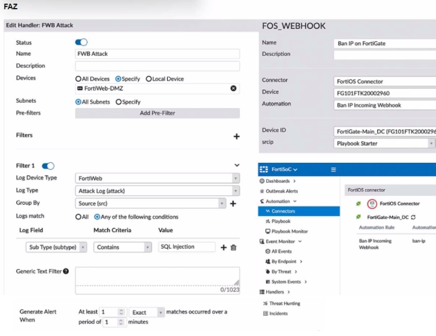 A customer is trying to setup a Playbook automation using a FortiAnalyzer, FortiWeb and FortiGate. The intention is to have the FortiGate quarantine any source of SQL Injection detected by the FortiWeb. They got the automation stitch to trigger on the FortiGate when simulating an attack to their website, but the quarantine object was created with the IP 0.0.0.0. Referring to the configuration and logs in the exhibits, which two statements are true? (Choose two.)