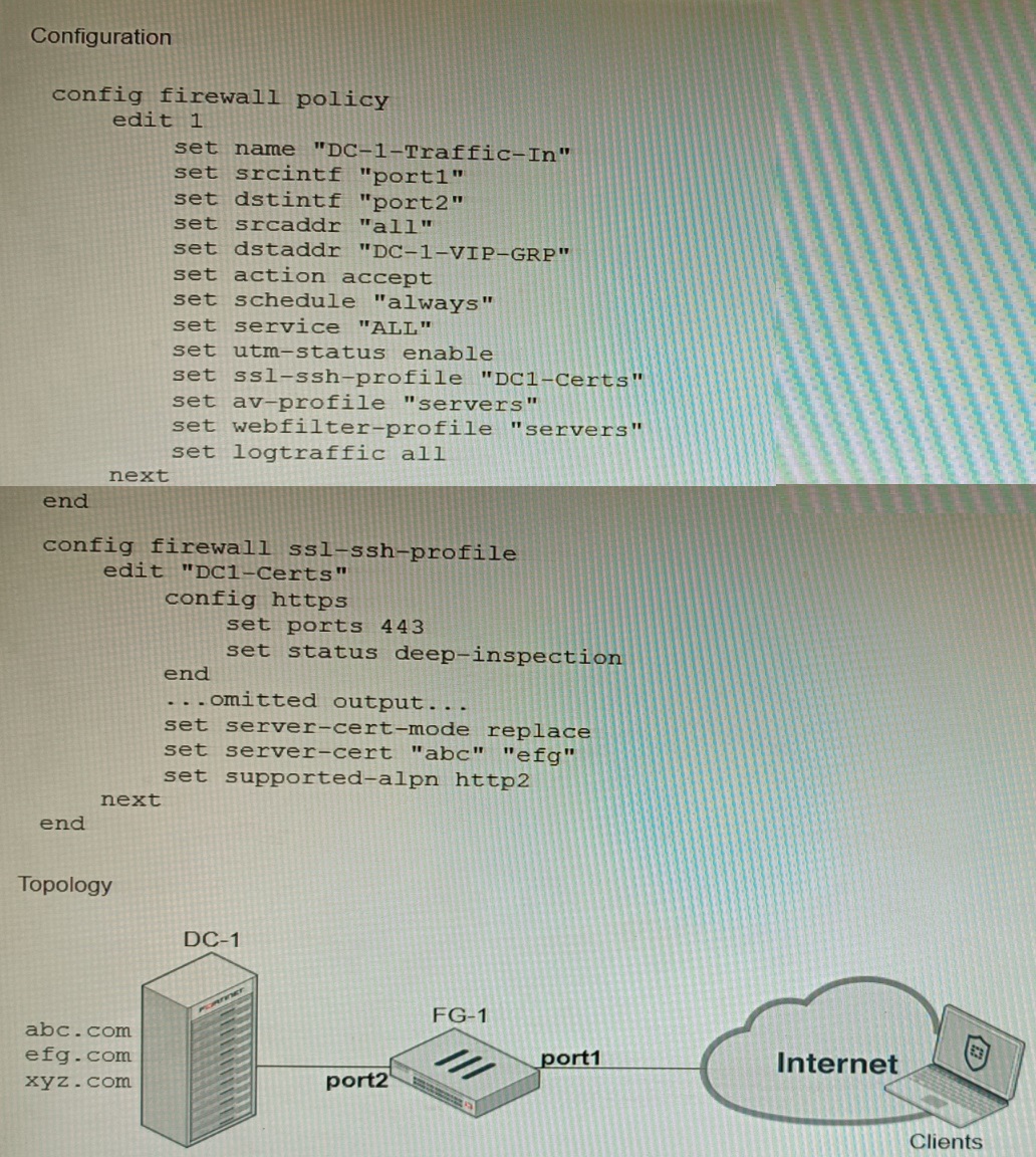 An administrator has configured an inbound SSL inspection profile on a FortiGate device (FG-1) that is protecting a data center hosting multiple web pages-Given the scenario shown in the exhibits, which certificate will FortiGate use to handle requests to xyz.com?