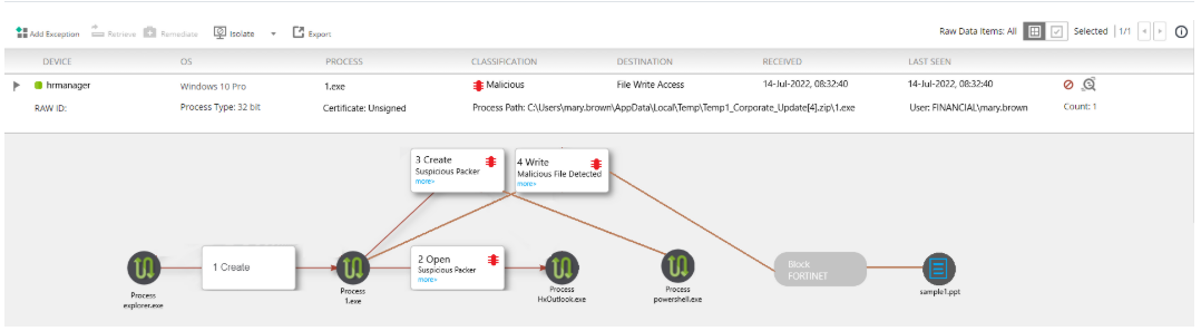 The exhibit shows the forensics analysis of an event detected by the FortiEDR core
