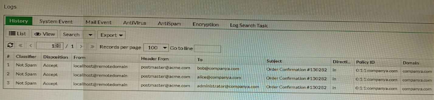 Refer to the exhibit showing the history logs from a FortiMail device.