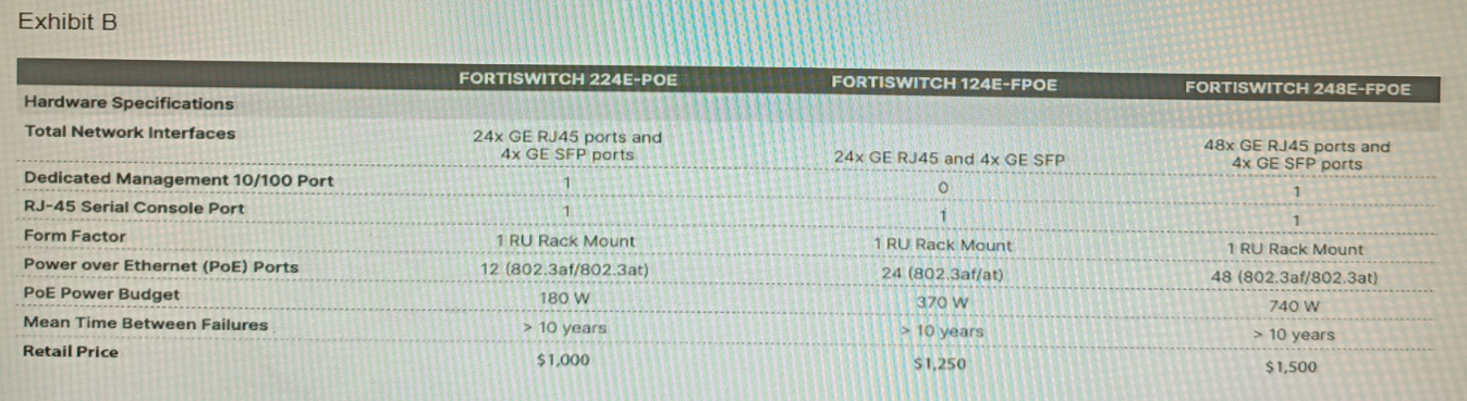 From the FortiSwitch models and sample retail prices shown in the exhibit, which build of materials would have the lowest cost, while fulfilling the customer's requirements?