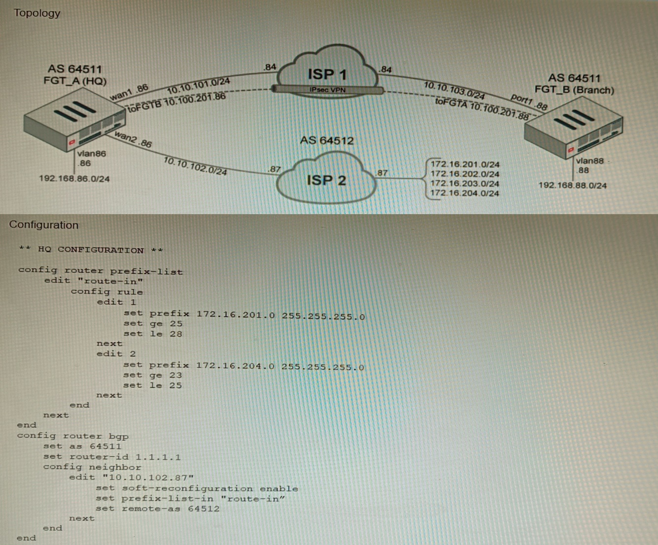 A customer has deployed a FortiGate with iBGP and eBGP routing enabled. HQ is receiving routes over eBGP from ISP 2; however, only certain routes are showing up in the routing table-Assume that BGP is working perfectly and that the only possible modifications to the routing table are solely due to the prefix list that is applied on HQ.