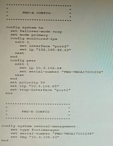 The administrator finds that VRRP HA mode is selected, but primary and secondary roles are greyed out in the GUI The managed devices never show online when FMG-B becomes primary, but they will show online whenever the FMG-A becomes primary.