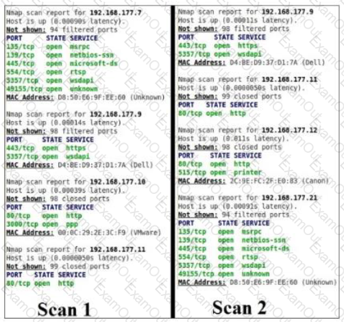 Scan 1 was taken on Monday. Scan 2 was taken of the same network on Wednesday. Which of the following findings is accurate based on the information contained in the scans?