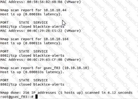 Use nmap to discover a host on the 10.10.10.0/24 network, scanning only port 8082 and using the SYN or Stealth scan approach. Which host has a service called -blackice-alerts"?