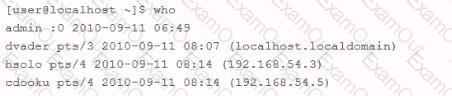 An employee is currently logged into the corporate web server, without permission. You log into the web server as 'admin" and look for the employee's username: "dmaul" using the "who" command. This is what you get back: