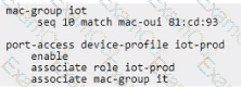 The test device needs to be assigned the "lot-prod'' role, in addition the "lot-default" role must be applied for any other device connected lo interface 1/1/1. This is a lab environment with no configuration of any external authentication server for the test.