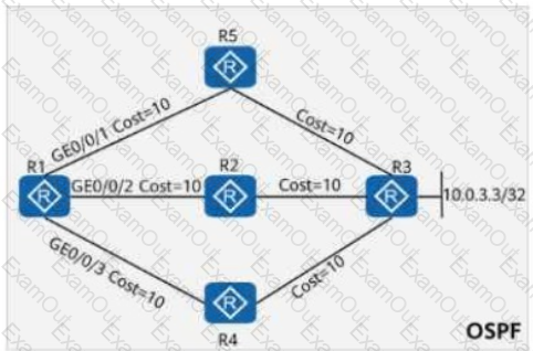 On the OSPF network shown in the figure, the cost values of links are marked. OSPF IP FRR is enabled on R1, and the maximum load-balancing 8 command is configured in the OSPF process. If a service passes through the path R1 → R5 → R3 to reach 10.0.3.3/32, which of the following is the backup outbound interface for the service?