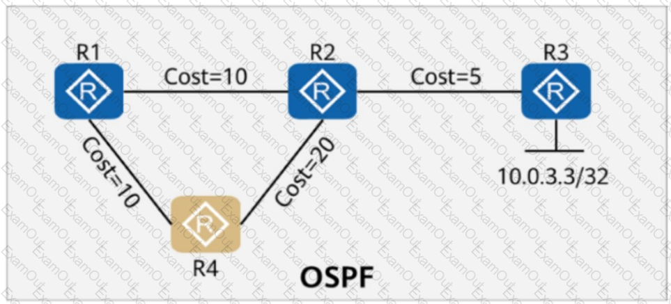 On the OSPF network shown in the figure, the cost values of links are marked. OSPF IP FRR is enabled on R1. The primary path from R1 to 10.0.3.3/32 is R1 -> R2 -> R3, and the backup path is R1 -> R4 -> R2 -> R3.