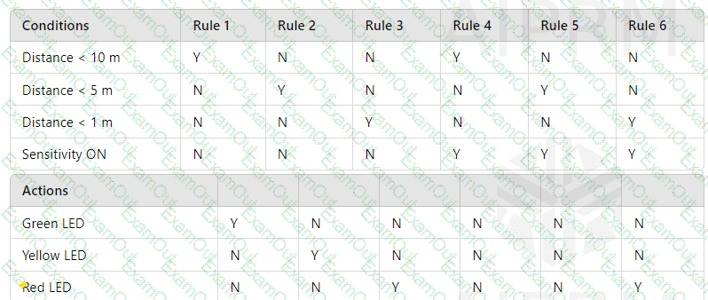 The following decision table describes the rules associated with the functioning of this proximity warning system: