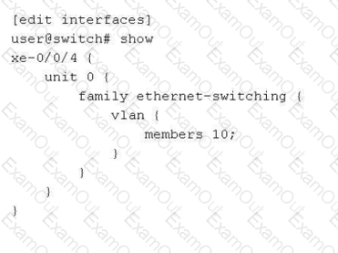 on a Juniper switch. It shows interfacexe-0/0/4withunit 0andfamily ethernet-switching. Under vlan, it lists members 10;`]